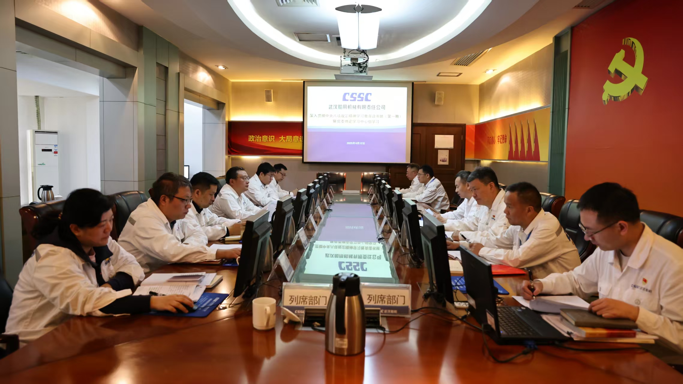 4月12日,中船集团武汉船机党委召开深入贯彻中央八项规定精神学习教育读书班(第一期)暨党委理论学习中心组学习会议。公司党委理论中心组成员参加学习研讨,公司党委副书记、总经理程立兵主持读书班并进行领学。